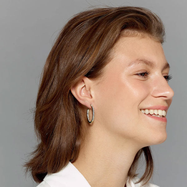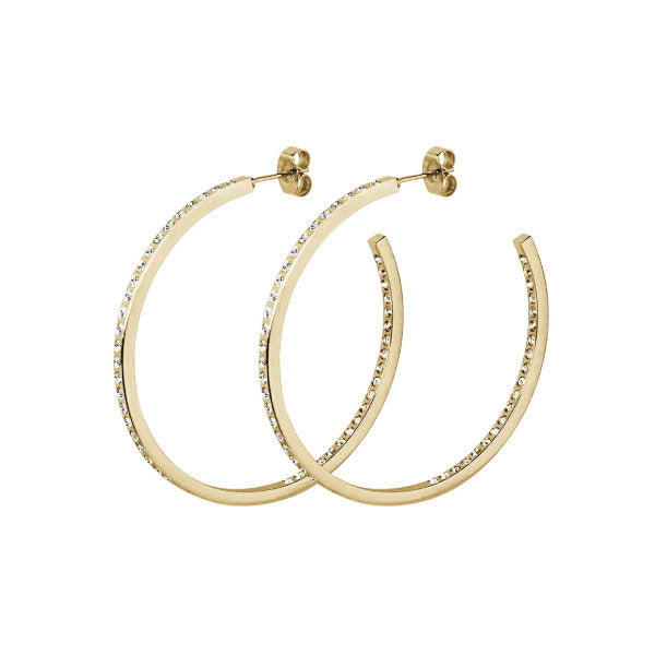 Large hoop earrings made with facet cut clear crystals, visible from the back as well. A classic piece with a cool edge to it. Shown here in a gold toned finish with clear crystals.