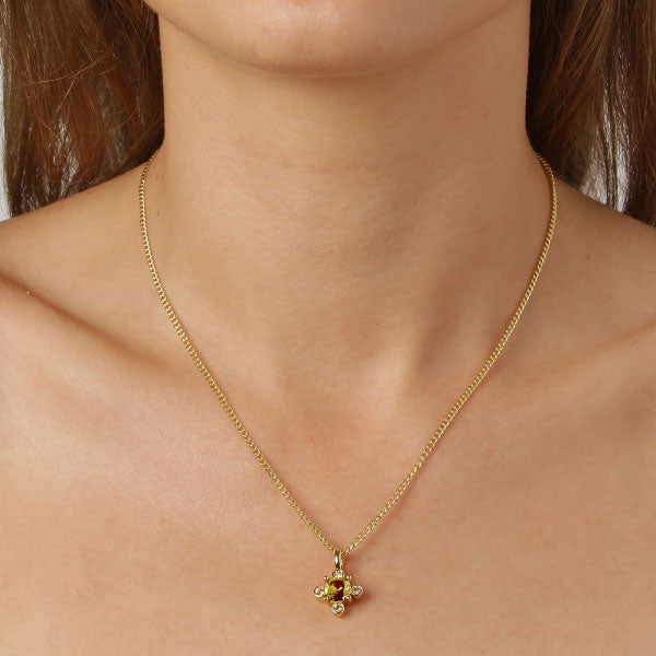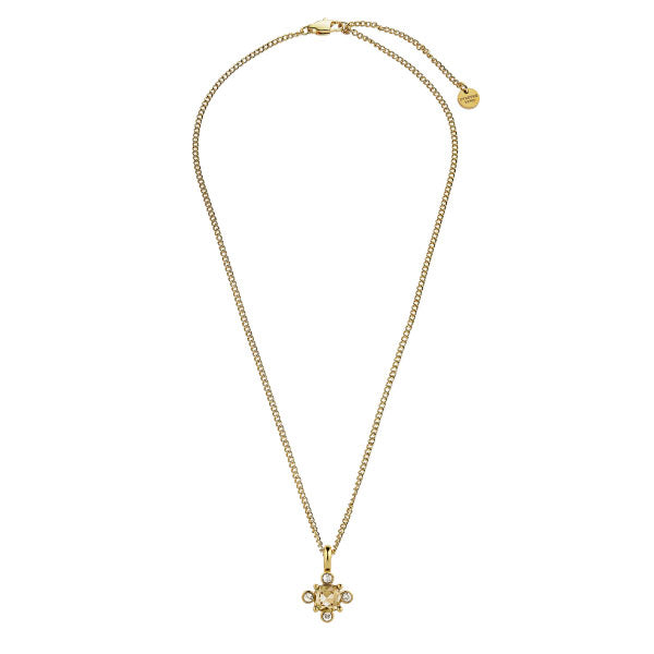 RIMINI - is a tiny, yet dramatic neck chain featuring a pendant with multible handset facet cut crystals, set in a foursided stylized floral motif, inspired by ancient glass mosaic windows. Total measurement about 40 cm + extension 5 cm. Here shown in shiny gold tone and beautiful golden / white crystals. DANISH DESIGN - free of cadmium, lead and nickel.