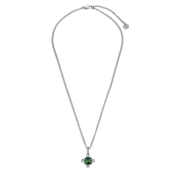 RIMINI - is a tiny, yet dramatic neck chain featuring a pendant with multible handset facet cut crystals, set in a foursided stylized floral motif, inspired by ancient glass mosaic windows. Total measurement about 40 cm + extension 5 cm. Here shown in shiny silver tone and a mix of emerald green and white crystals. DANISH DESIGN - free of cadmium, lead and nickel.