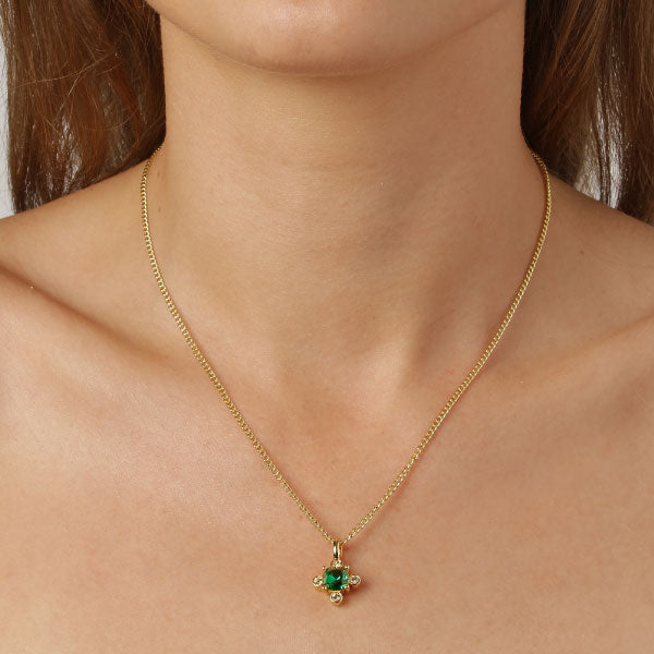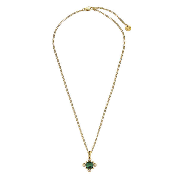 RIMINI - is a tiny, yet dramatic neck chain featuring a pendant with multible handset facet cut crystals, set in a foursided stylized floral motif, inspired by ancient glass mosaic windows. Total measurement about 40 cm + extension 5 cm. Here shown in shiny gold tone and emerald / white crystals. DANISH DESIGN - free of cadmium, lead and nickel.