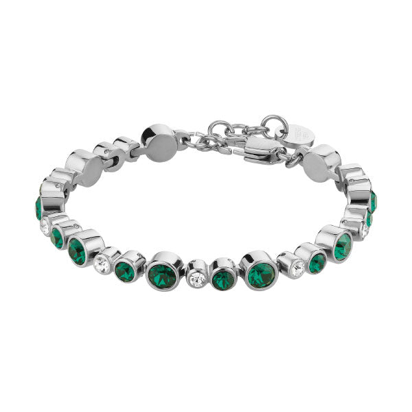 TERESIA is a feminine and chic bracelet made with a row of crystals in various sizes for an irregular look.Made in stainless steel and plated and polished to perfection. Here shown in cool urban combination of cool white and and emerald green shades on silver toned finish. Length 17 cm + extension. DANISH DESIGN - free of cadmium, lead and nickel.Materials: