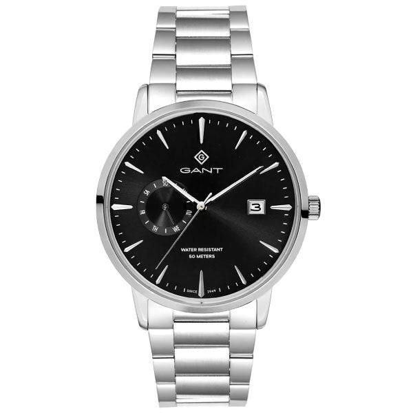 The Gant East Hill watch offers a modern look with a round face and a clean dial, featuring sleek hour markers and a small sub-dial for added detail. The watch includes a date window, adding practicality to its stylish design. The case is attached to a metal link bracelet, which complements the overall aesthetic. Its bold appearance is highlighted by a 43 mm diameter, making it a standout piece on the wrist. The watch operates with quartz movement driven by the Miyota JP27 caliber.