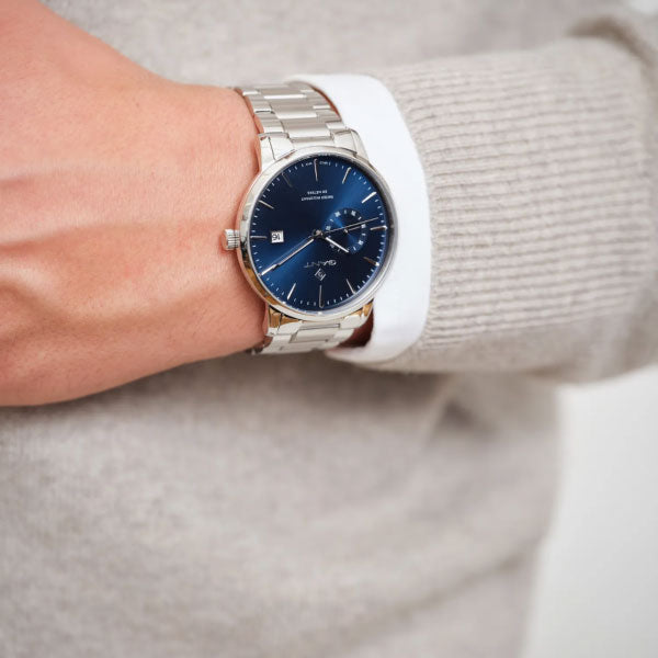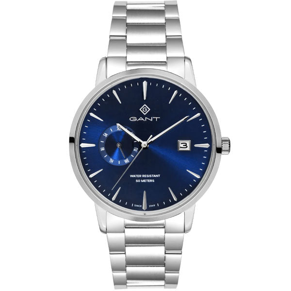 The Gant East Hill watch features a sleek, minimalist design with a round case and a striking blue dial. The dial is enhanced by contrasting lighter hour markers and hands, complemented by a small sub-dial for added functionality. The watch face is framed by a silver bezel, and the overall design is completed with a stainless steel strap, offering a classic and timeless look. The deployant clasp ensures a secure fit, making it comfortable for daily wear.