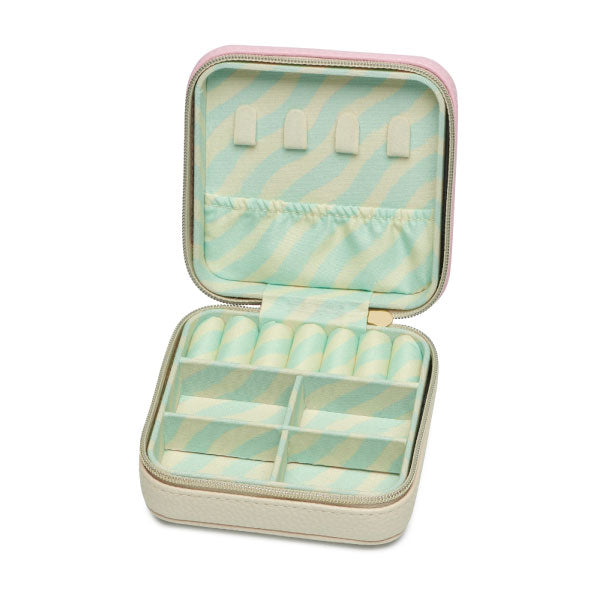 Our Square Jewellery Box in blush and cream grain finish serves both fashion and function. An aesthetically-pleasing square shape box, with internal compartments for storing your necklaces, bracelets and earrings with an internal mint wave print.