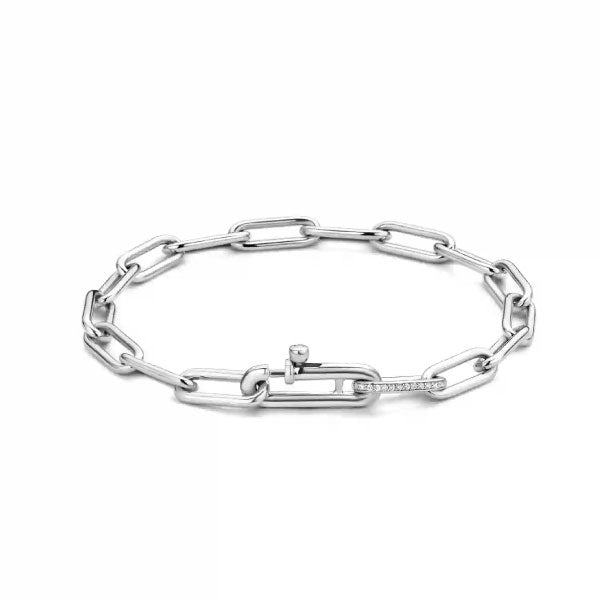 This TI SENTO closed forever silver bracelet has 925 sterling silver medium-sized links. The handset zirconia on the centrepiece safety-lock adds a touch of sparkle. Vintage shapes and silver magic.