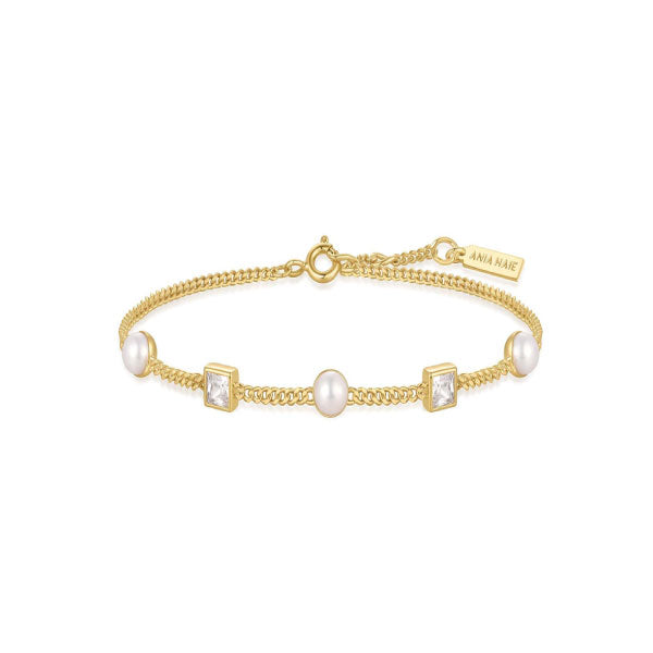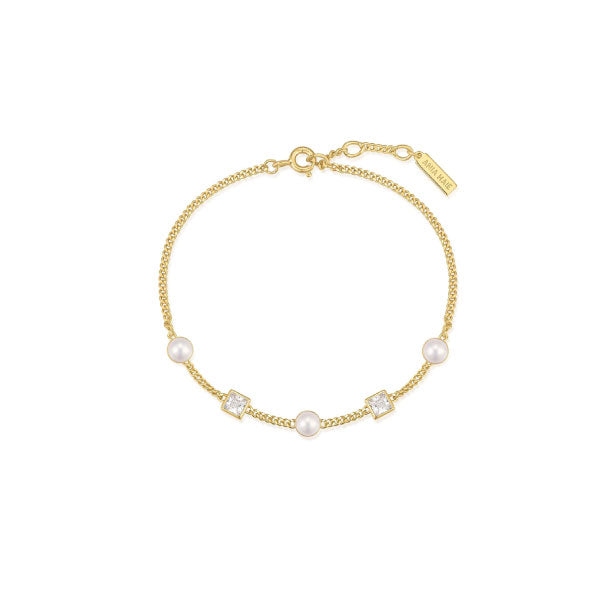 This gold-plated bracelet blends structure and softness through a fresh pairing of bezel-set cubic zirconia cubes and luminous pearls.