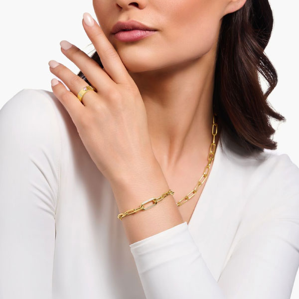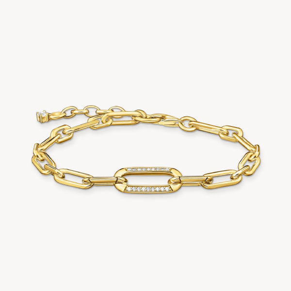 Timeless contrast: this bracelet is the ideal gift for a special occasion. Its anchor elements are accentuated and exude both purism and modern timelessness. The bracelet’s highlight is a bigger, faceted element as the centrepiece that is embellished with round-cut, white zirconia stones. Its end is adorned with a sparkling white zirconia stone.