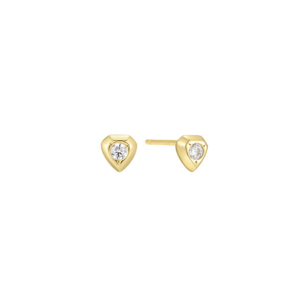 Sculpted in a soft shield shape, these small gold stud earrings feature a polished 14ct gold plated finish, highlighted by a single round cubic zirconia at the centre. Compact yet characterful, the triangular design makes them a versatile styling piece – ideal for stacking with gold huggies or hoops. Crafted in sterling silver and finished with a secure post and butterfly back.