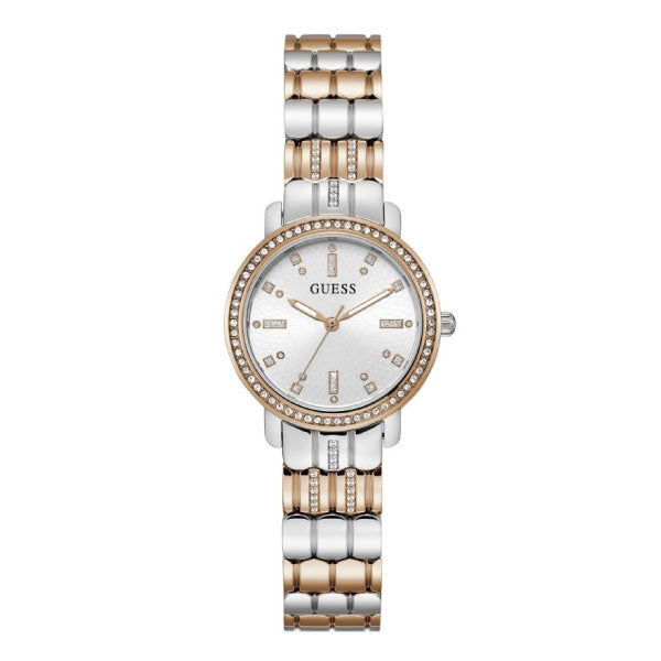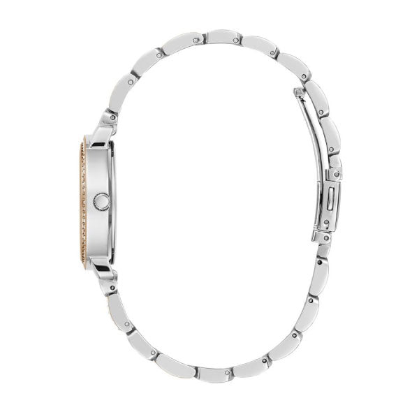 Elegance awaits with this overall glitzy watch featuring a polished bracelet look with crystal details that run throughout.