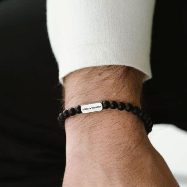 Natural Ned Silver and Matte Black Round Gemstone Mens Bracelet