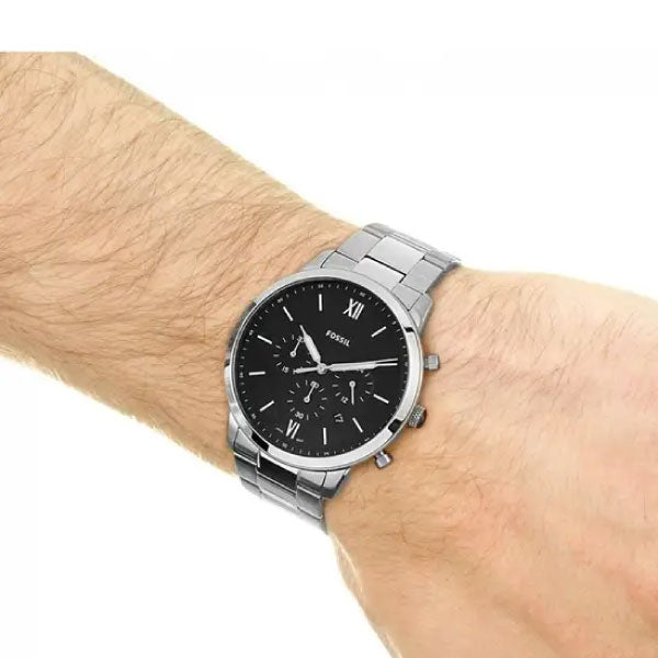 The Fossil Neutra is a smart and practical gents watch. It has a classic look with the silver case/black dial combination. On the dial you will see the chronograph subdials and the date function. The case and bracelet are made from Stainless Steel.