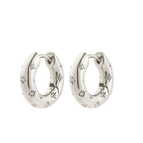 Shine like the night sky! Silver chunky huggie hoops with an easy-to-use click clasp and petite Preciosa crystals that capture the magic of a starry night. This season's ultimate go-to piece, perfect for adding a hint of sparkle to both everyday and festive moments. Wear them alone for an effortless statement or pair with other earrings for a personal stacked vibe.