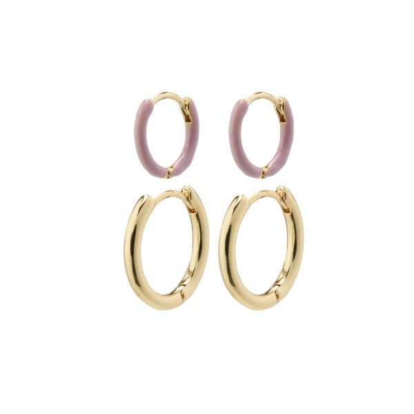 Cultivate your individuality with Pilgrim's shiny and colourful summer hoops. You get a set of gold-plated medium size creoles, and a set of small huggie hoops with detail of purple enamel, creating a free-spirited and relaxed look. Mix and match according to your mood, and style the simplistic hoops with colourful and personal accessories for a bohemian look.