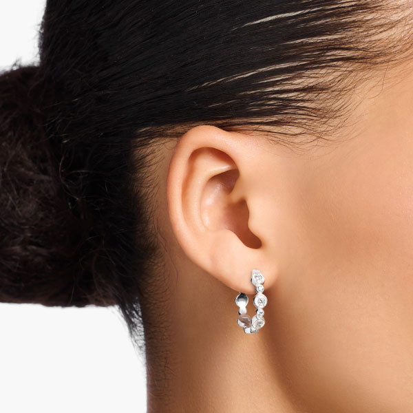 Round perfection: these hoop earrings made of high-quality 925 Sterling silver will delight you with their timelessly simple design. They are designed with six round-cut zirconia stones in white and round highlights. The stones are set by hand in a bezel setting. Whether worn individually or in combination with other earrings – the hoop earrings are a sparkling eye-catcher and perfect as a gift for a special occasion.
