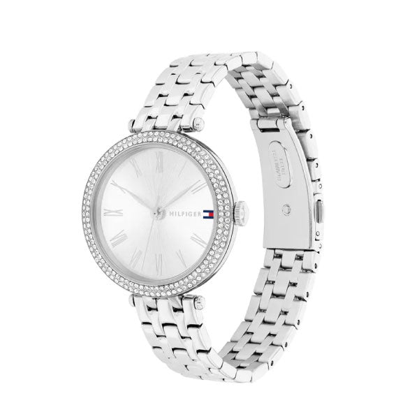 Introducing this stunning design from Tommy Hilfiger and part of the Natalie collection. Encrusted with a bezel of sparkling round brilliant cut cz stones this is a piece designed not to be missed. The simple silver dial gives an everyday feel to this dressy piece, a large 34mm case completes the look with a stainless steel bracelet strap.