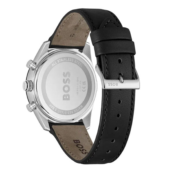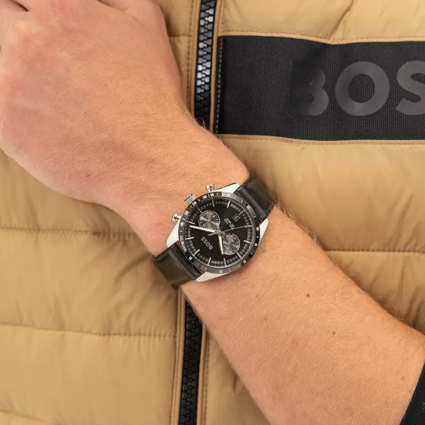 The BOSS Tourmaster watch features a round case paired with a leather strap, offering a classic and versatile look. The black-toned dial, framed by a matching, includes sub-dials for added functionality. The hour markers and hands are designed for clear readability, and the crown and pushers enhance both the watch's functionality and style. This timepiece is a part of the BOSS Tourmaster collection, showcasing a 41 mm diameter that makes a subtle yet powerful statement on the wrist.
